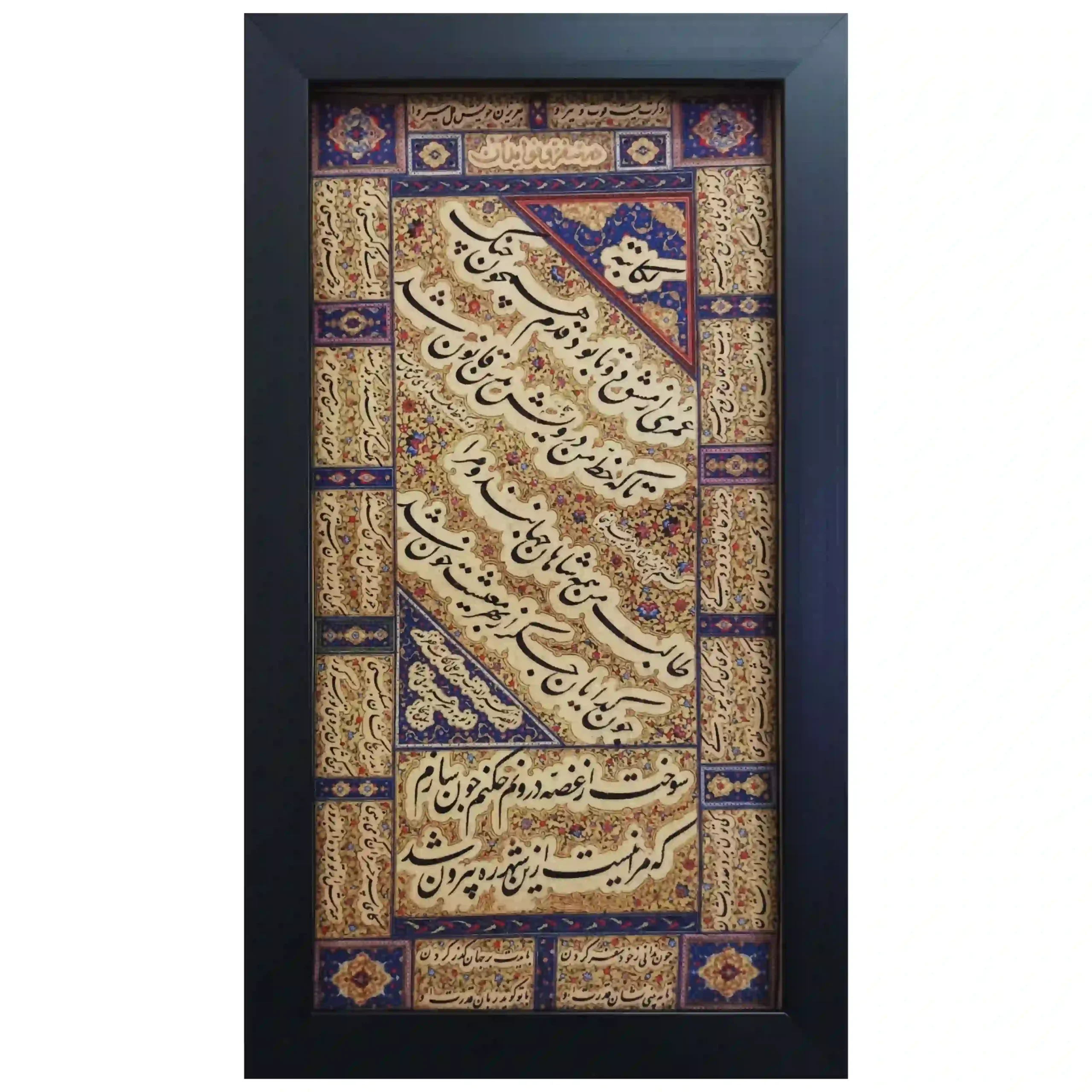 محصولی که در تصویر مشاهده می کنید تابلو نستعلیق (Nastaliq Panel) عمری از مشق نام دارد . این چلیپای نستعلیق اثری از استاد مرحوم میرعلی هروی می باشد . تابلو عمری از مشق روی پارچه مخمل چاپ شده و قاب گرفته شده است و آماده فروش با قیمتی مناسب می باشد .